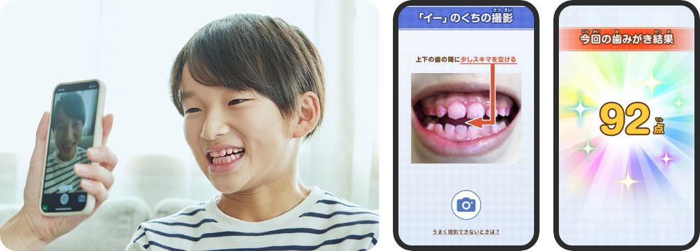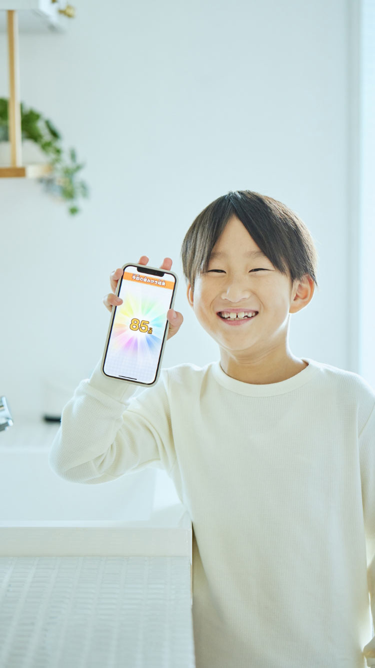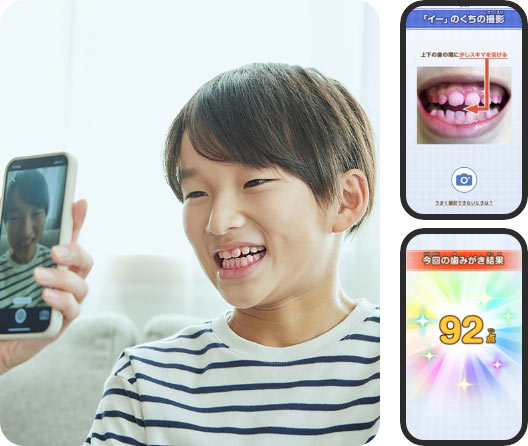週1回程度のペースで、専用アプリにて染め出し歯みがきによる歯みがきの採点をご用意しています。ご家庭の状況に応じて取り組んでください。